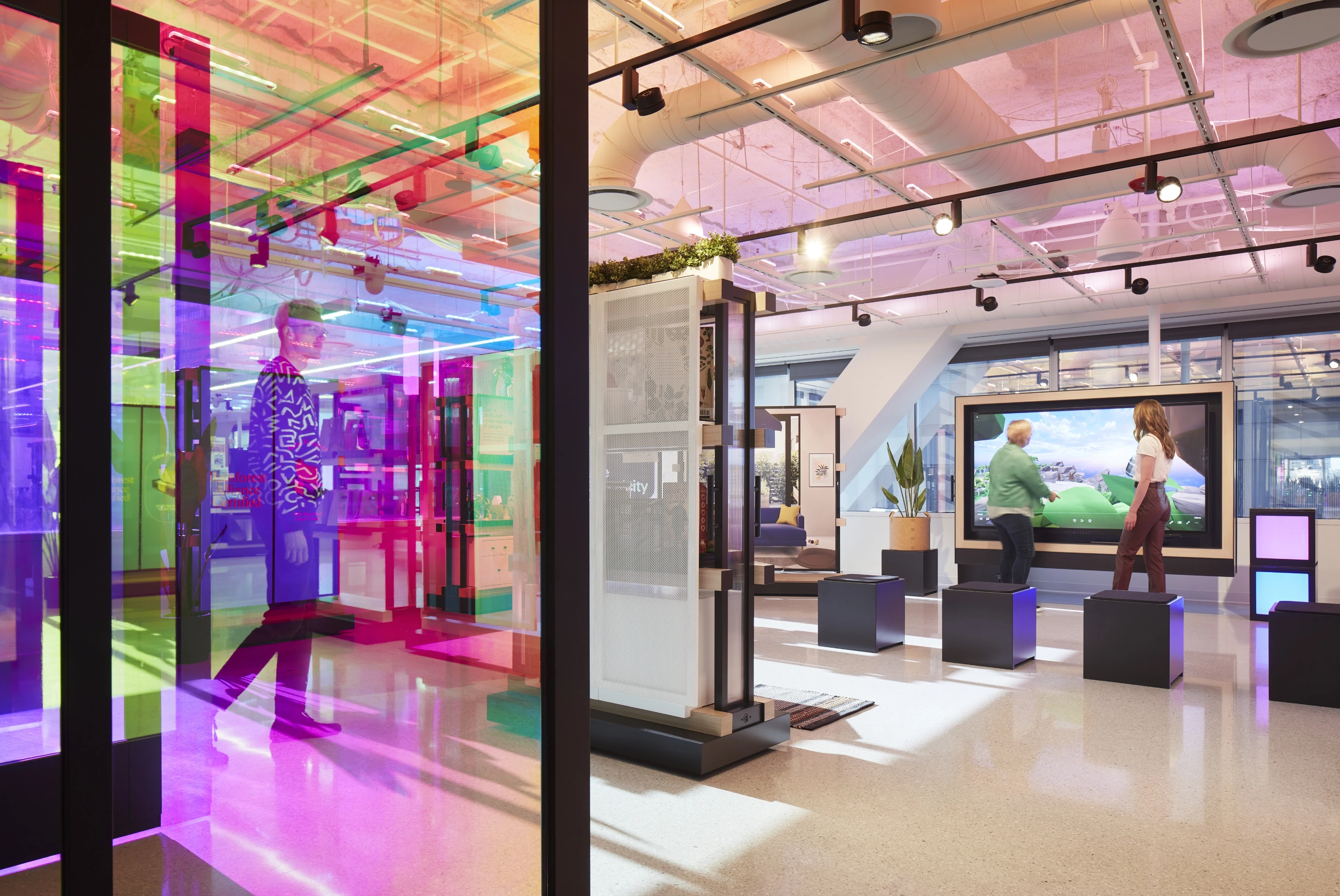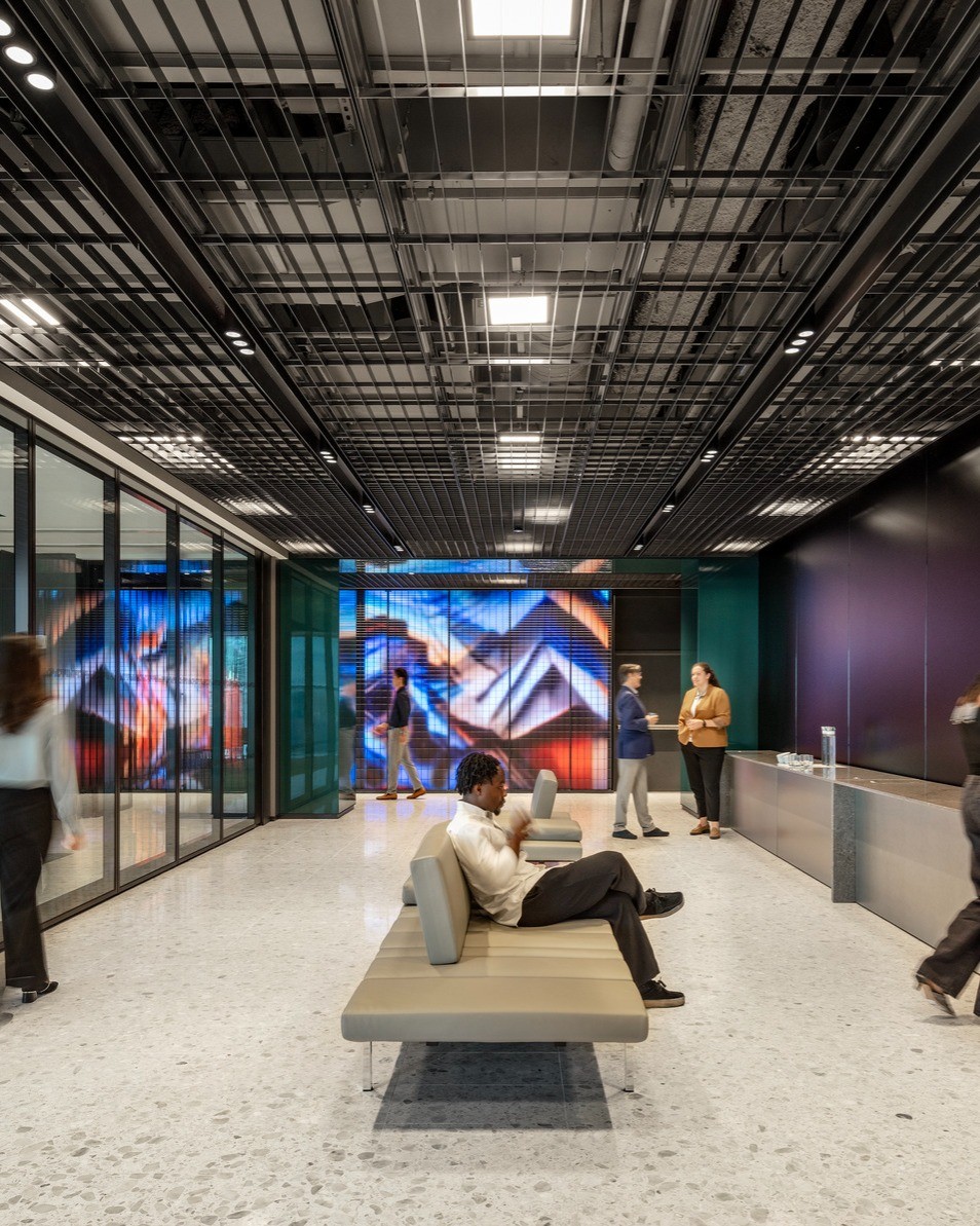A hyper modular fixture system paired with programmable digital surfaces and lighting creates a one of a kind innovation space.